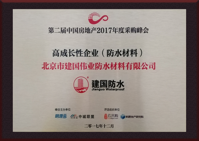 2017年12月7日,由中國建筑防水協(xié)會主辦的《全國建筑防水行業(yè)質(zhì)量提升工作大會暨2017年建筑防水行業(yè)年會》在??谡秸匍_。本次會議對2017年防水行業(yè)取得的成績和質(zhì)量提升方面面對的問題、挑戰(zhàn)進(jìn)行了詳細(xì)解讀,對質(zhì)量提升提出了新的要求和建議,并對質(zhì)量提升及科技進(jìn)步企業(yè)進(jìn)行表彰。建國偉業(yè)集團(tuán)榮獲“2016-2017年建筑防水行業(yè)先進(jìn)企業(yè)”稱號。